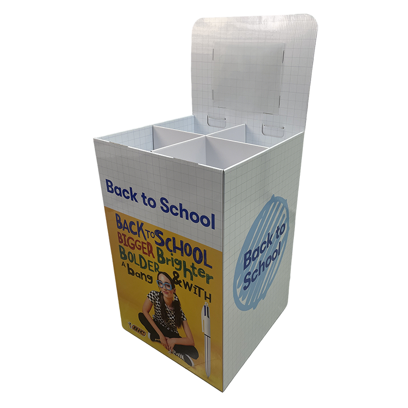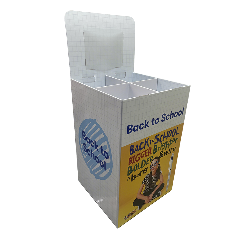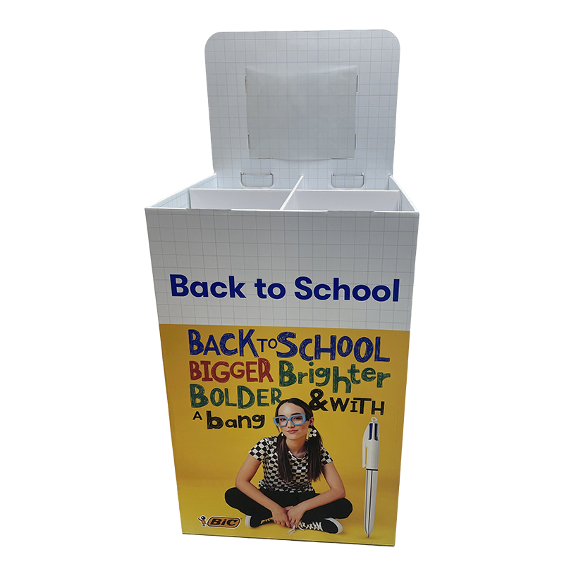 ![]() | BIC Stationary Dumpbin Display Specification: Size: Can be customized Material: 350g CCNB+ B flute Accessories: Plastic Pocket Printing Method: Off set full color printing Package: Flat Individually Packed |