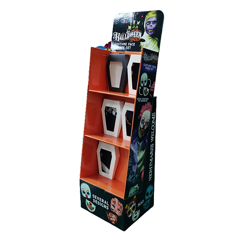 ![]() | Halloween Face Mask Floor Display Specification: Size: Can be customized Material: 350g CCNB+ B flute Printing Method: Off set full color printing Package: Flat Individually Packed |